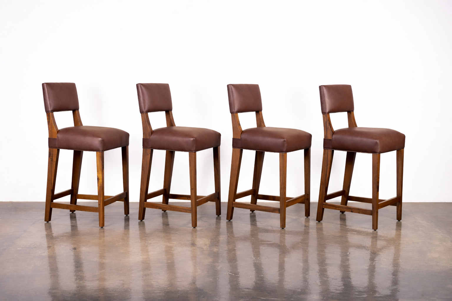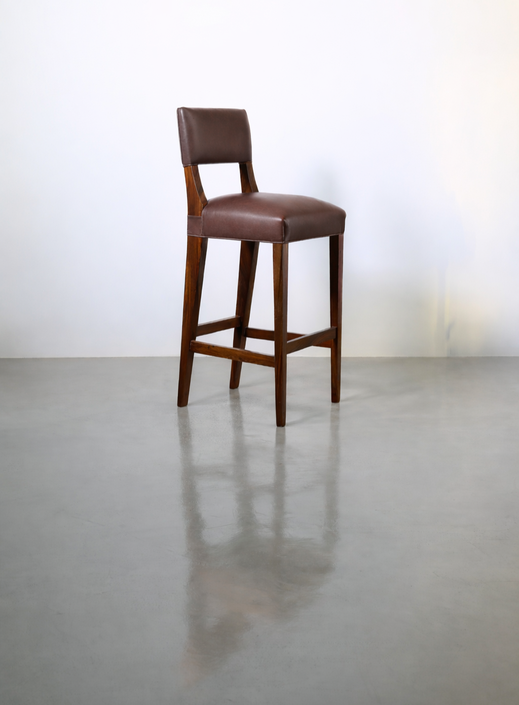 Is characterized by its signature sloping back leg and hand-carved Argentine Rosewood frame. For this location, the stools were delivered in raw leather to allow Berluti’s artisans to apply their proprietary hand-finished patina, ensuring the furniture integrates perfectly with the brand’s heritage.