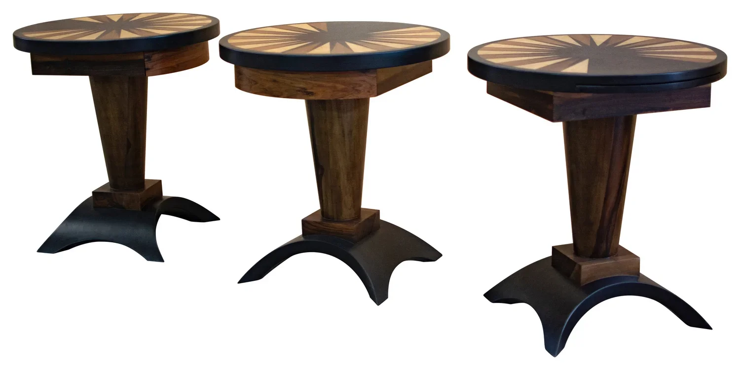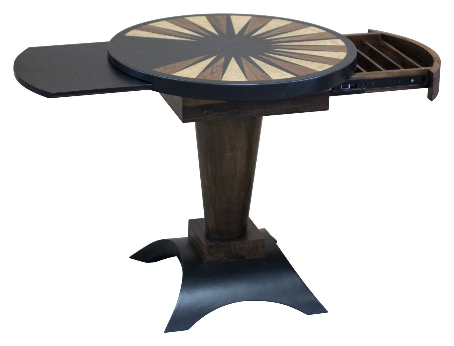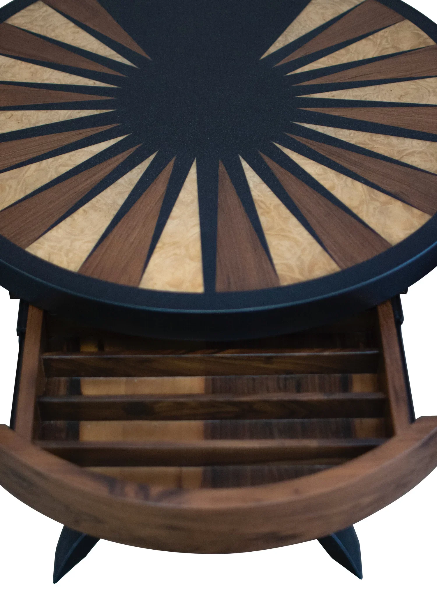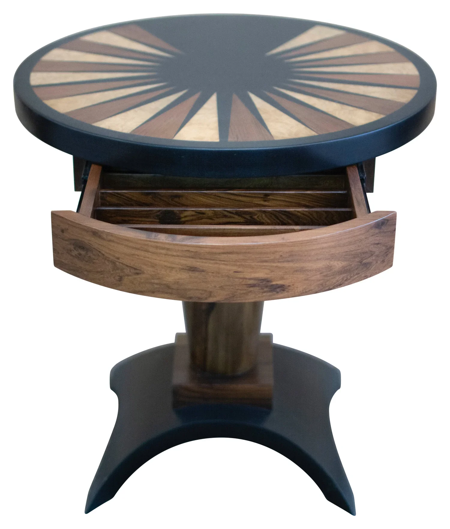 Shown in an Argentine Rosewood base and top with an ebony and bird's-eye maple inlay for the board. Features a tray for cocktails when game is in play, as well as a drawer for chips and dice, or additional cocktail space.