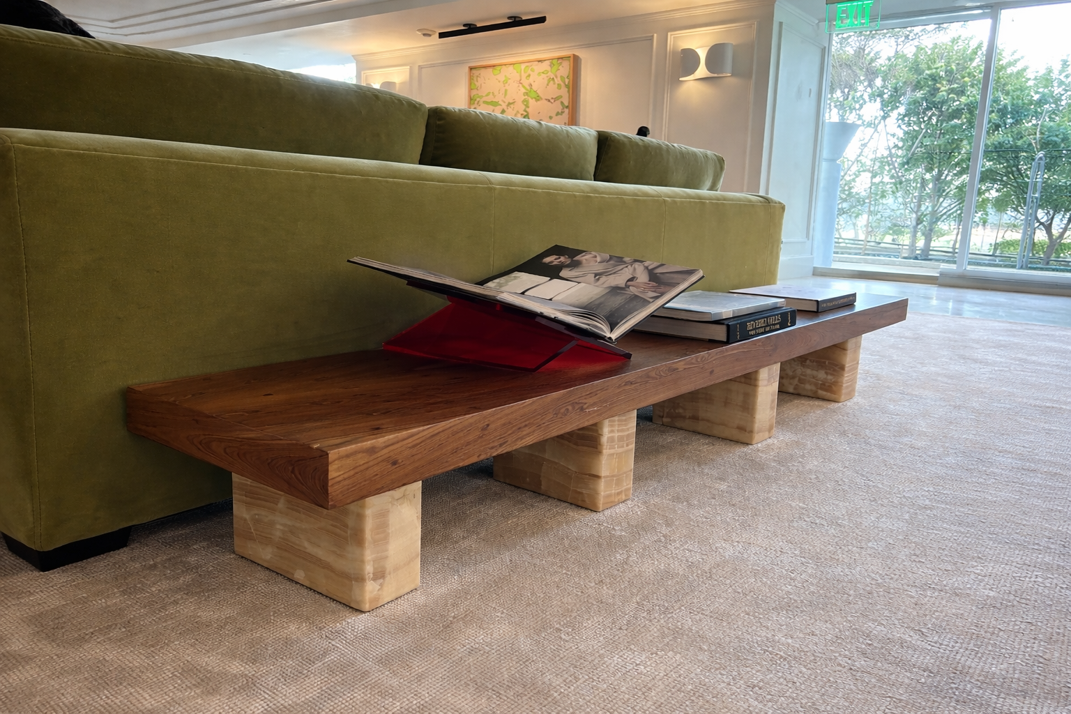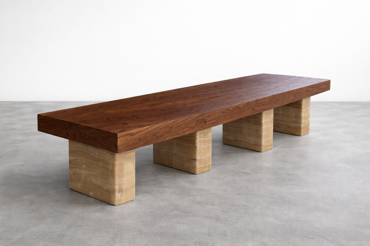 Rectangular table of Argentina Rosewood, highlighting its deep, organic grain, supported by Onyx block bases.