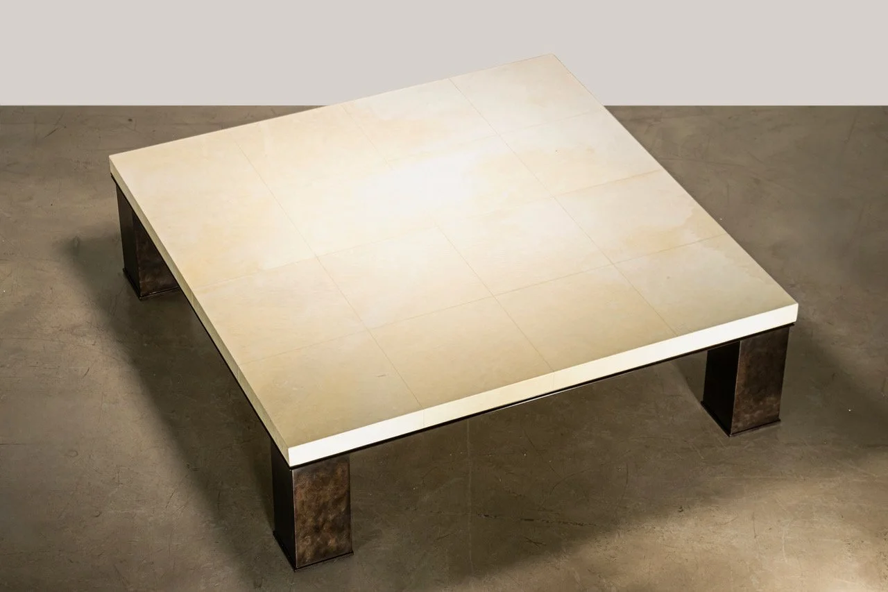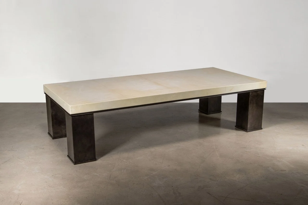 Table covered in parchment with an internal structure of solid wood and non-cast metal legs with a lacquered finish.