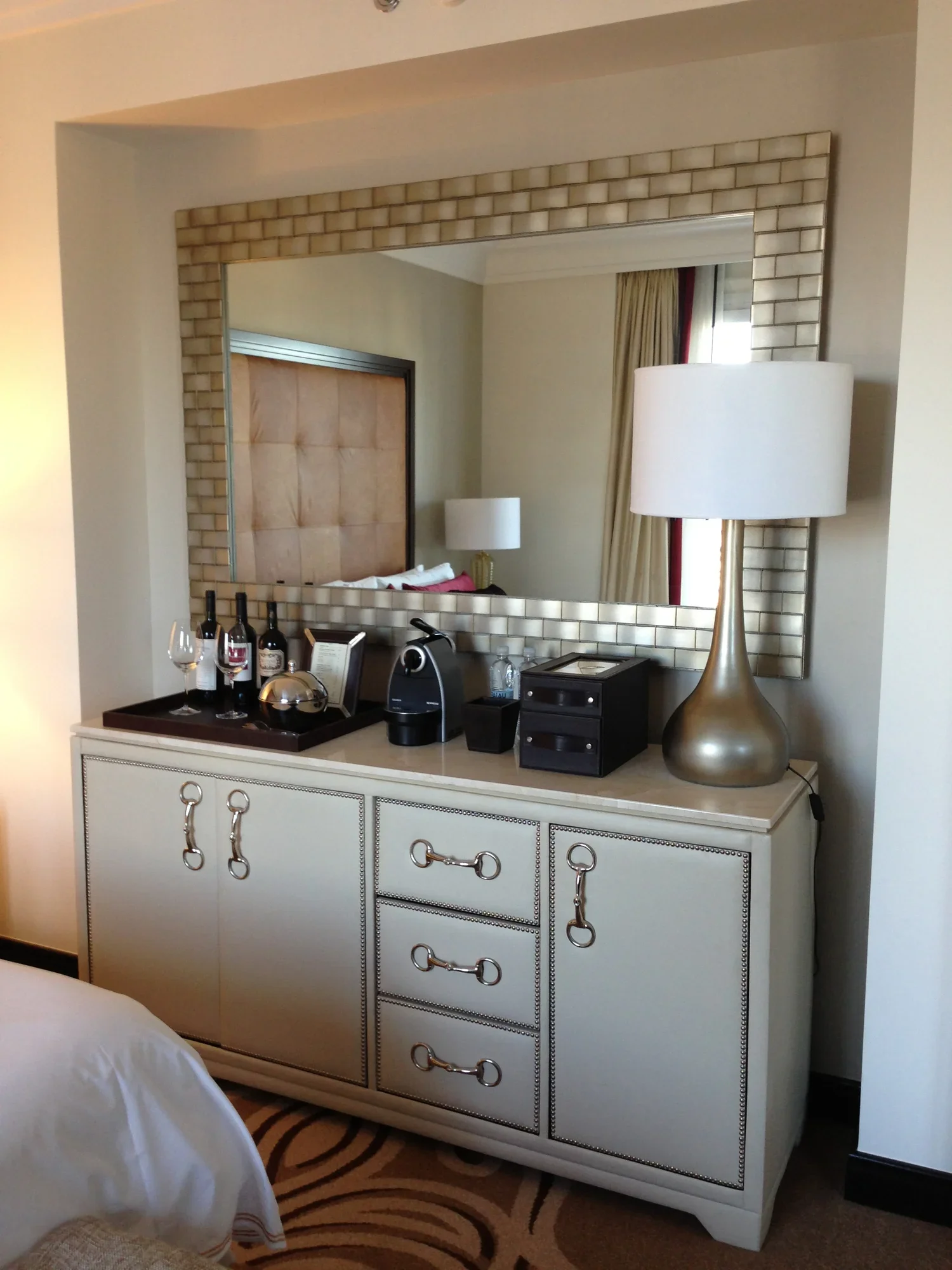 The leather-wrapped minibars and matching nightstands featured over 3000 custom cast, polished aluminum pulls in the shape of horse-bits.