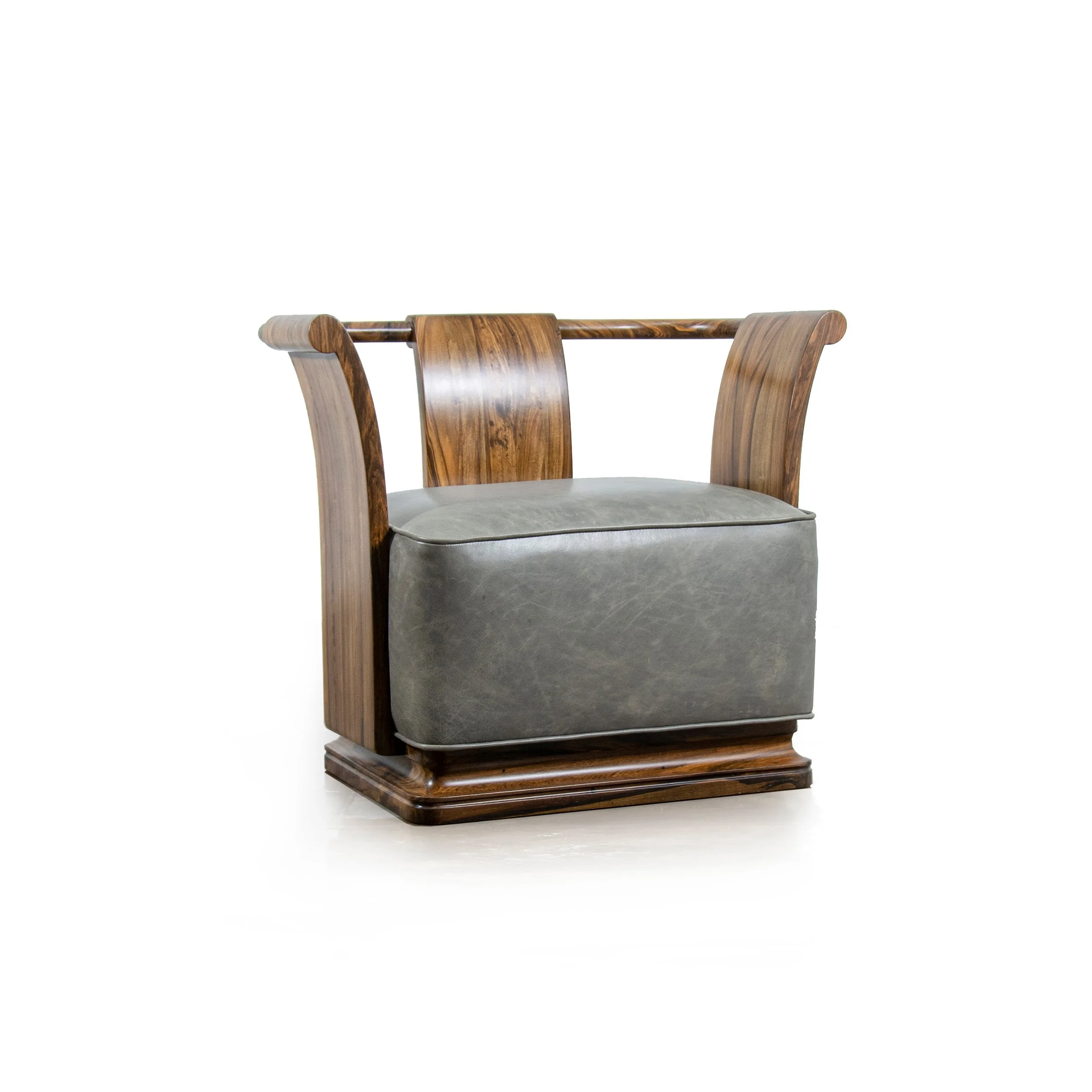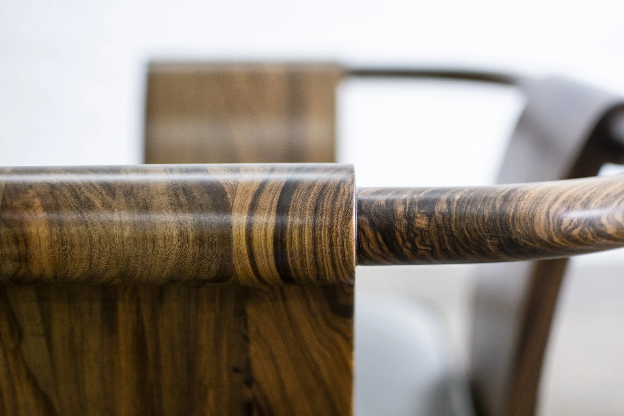 The Simone Chair’s gently sloping sides and back evoke forms from early 20th-century Art Deco design. Shown in Argentine Rosewood but available in any solid wood and the upholstery material of your choice.
