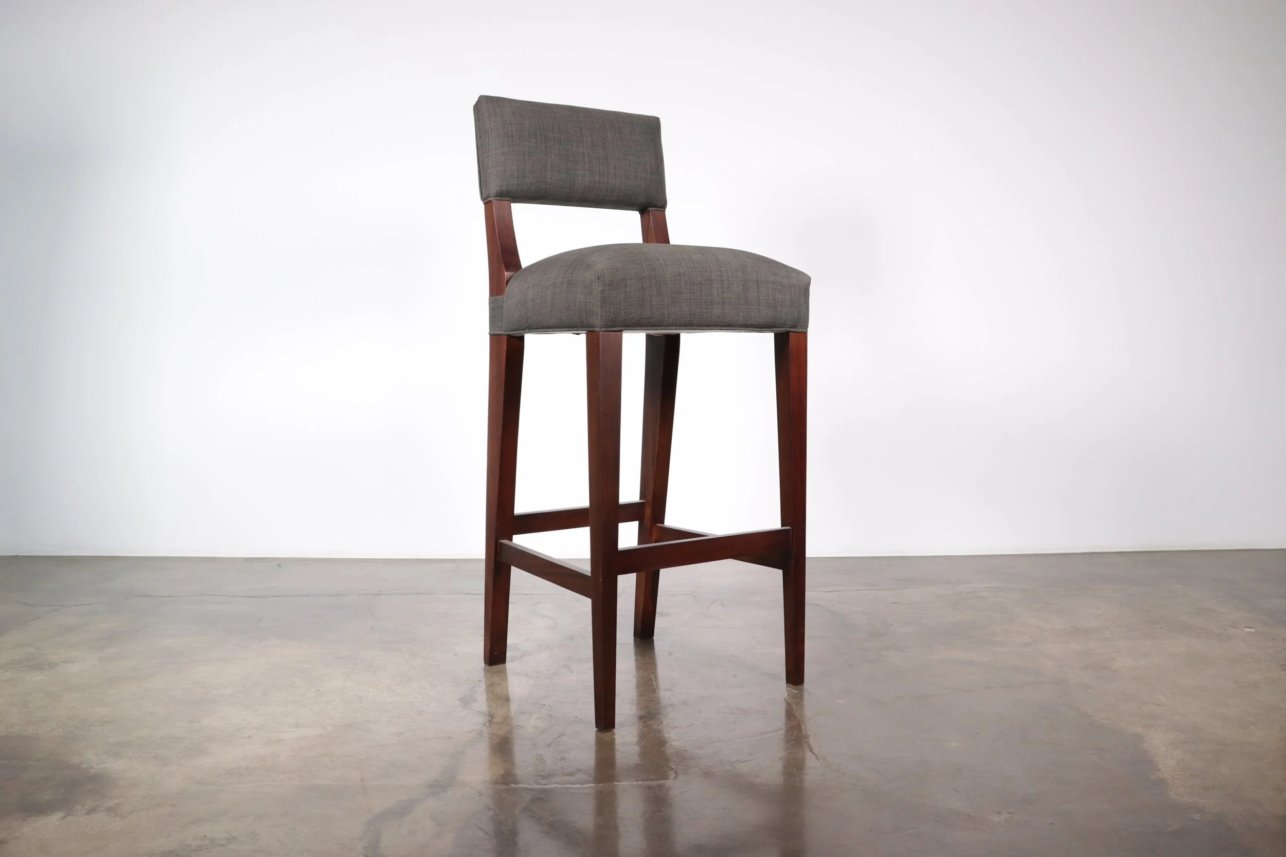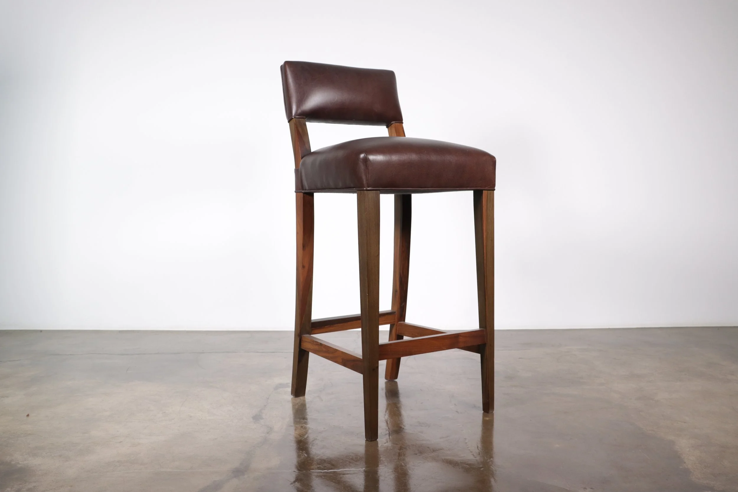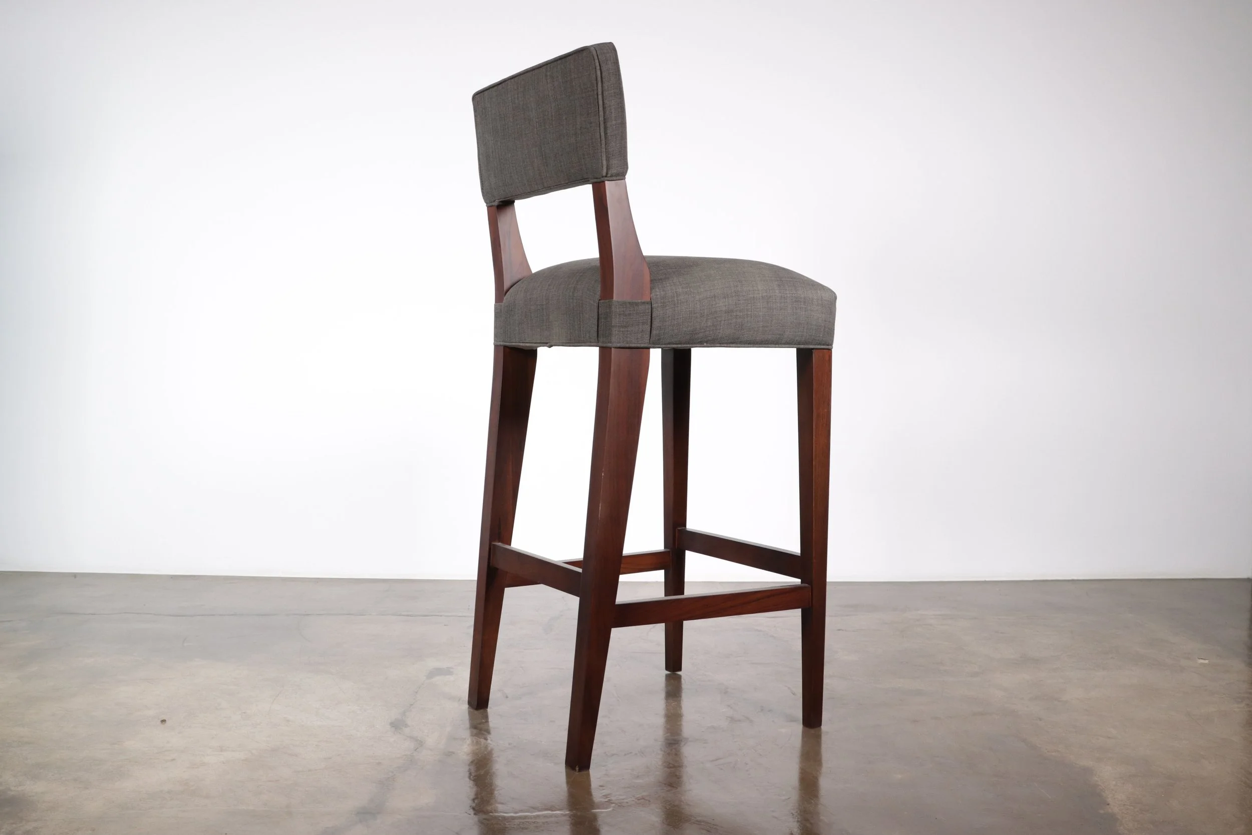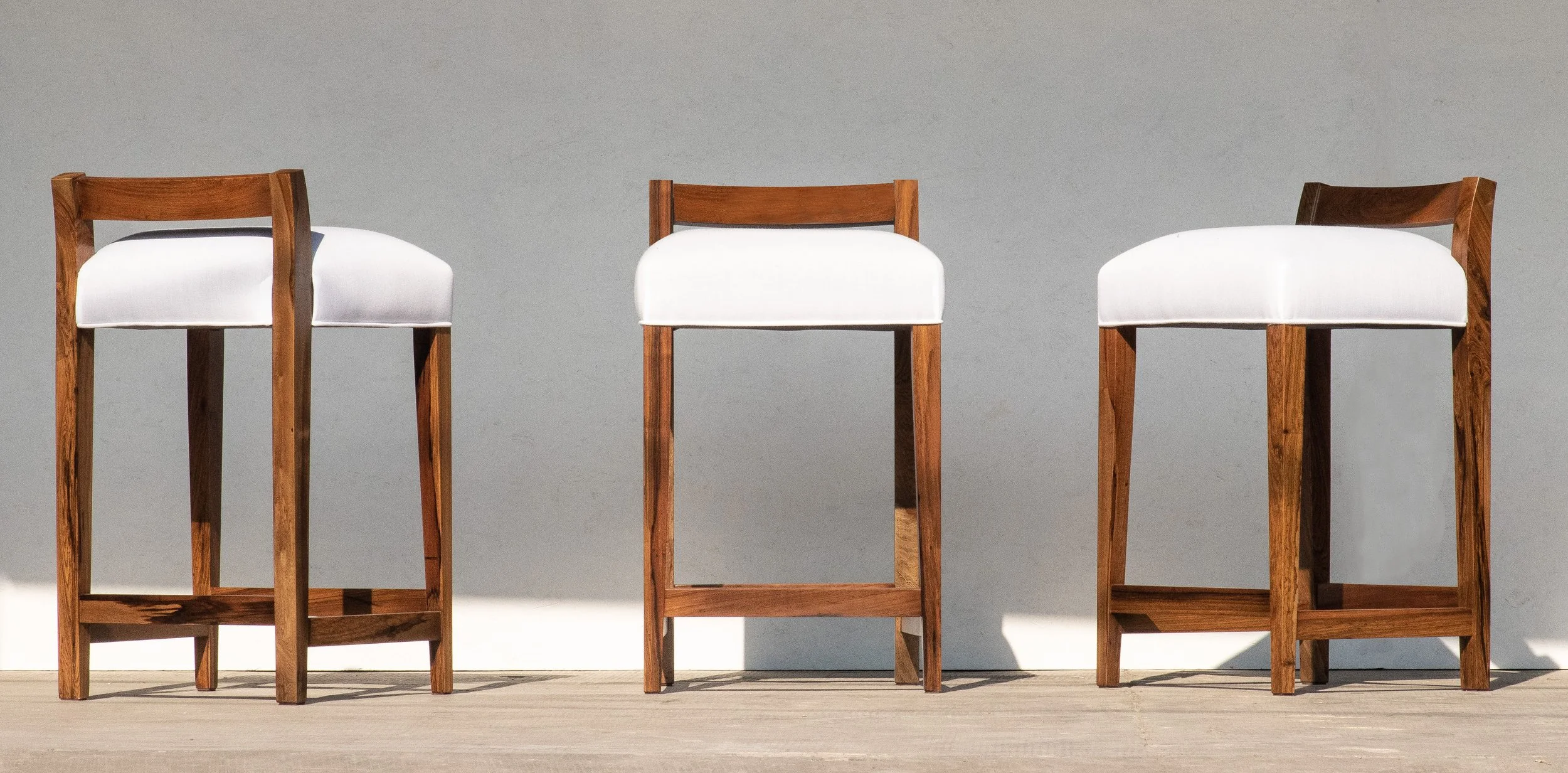 The Renzo Stool features a solid wood frame with a slatted back and a gently curving back leg. Shown in Argentine Rosewood.