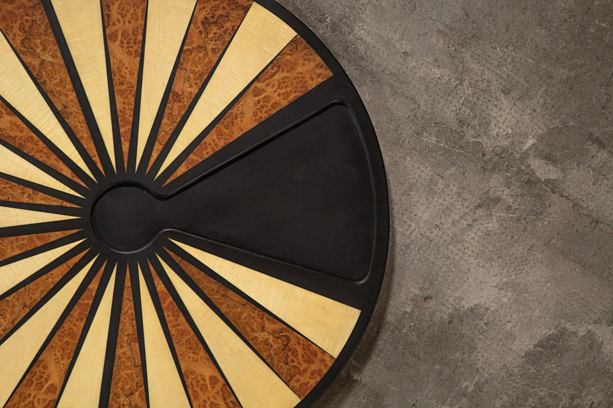 The Clariss Tables feature an irregular top, offering a unique profile from every angle. Shown here in a dark walnut finish.