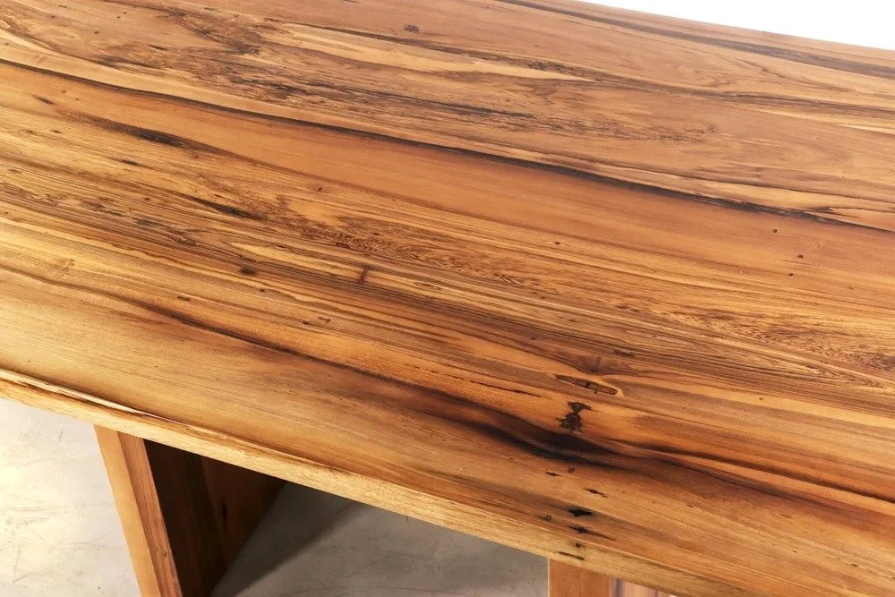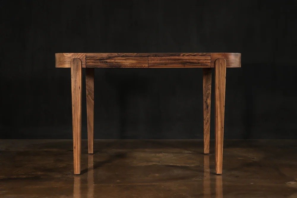 This sleek and elegant console table features hidden drawers mitered into the front edge, creating a seamless silhouette. Shown here in natural Argentine Rosewood.